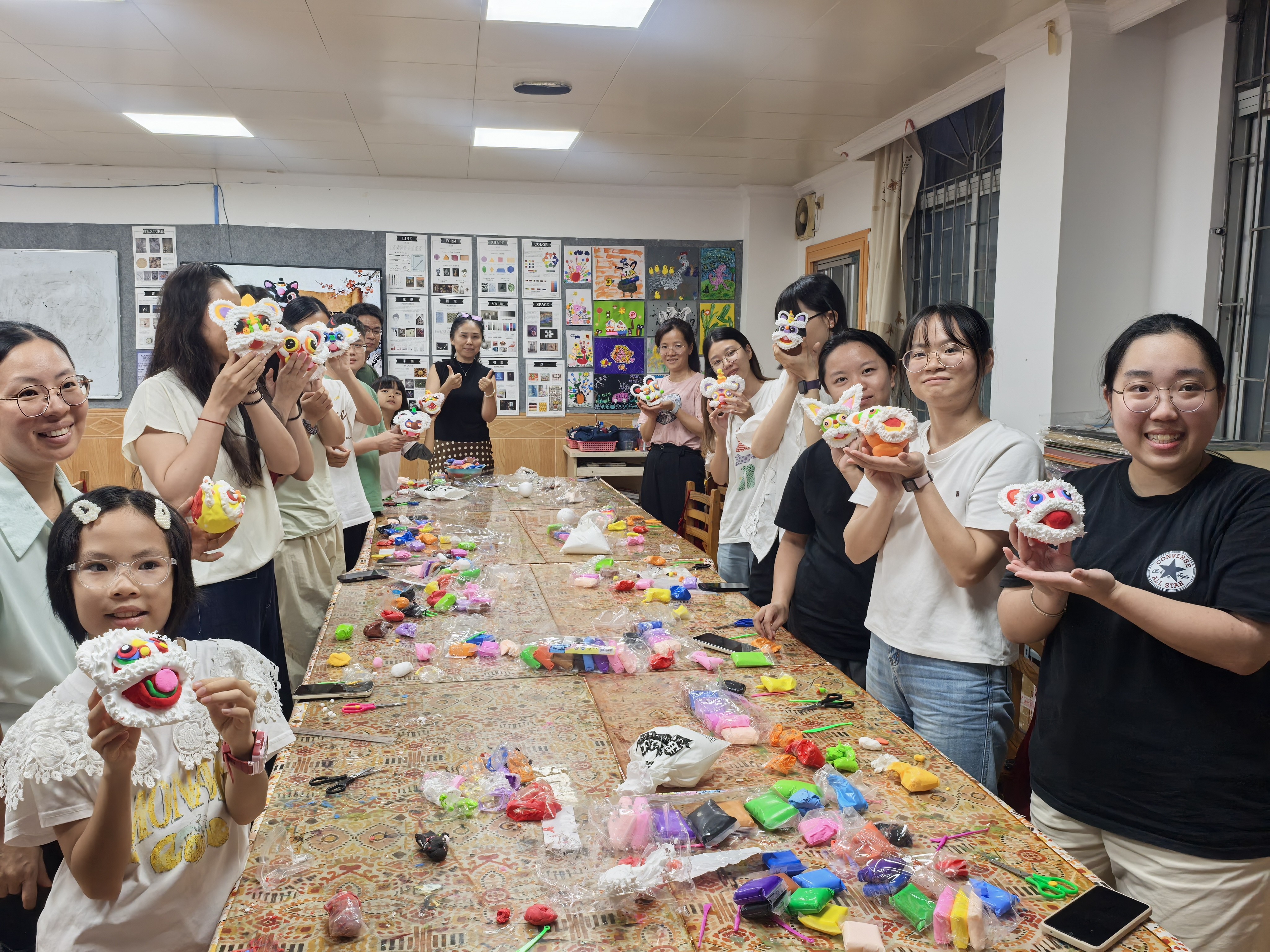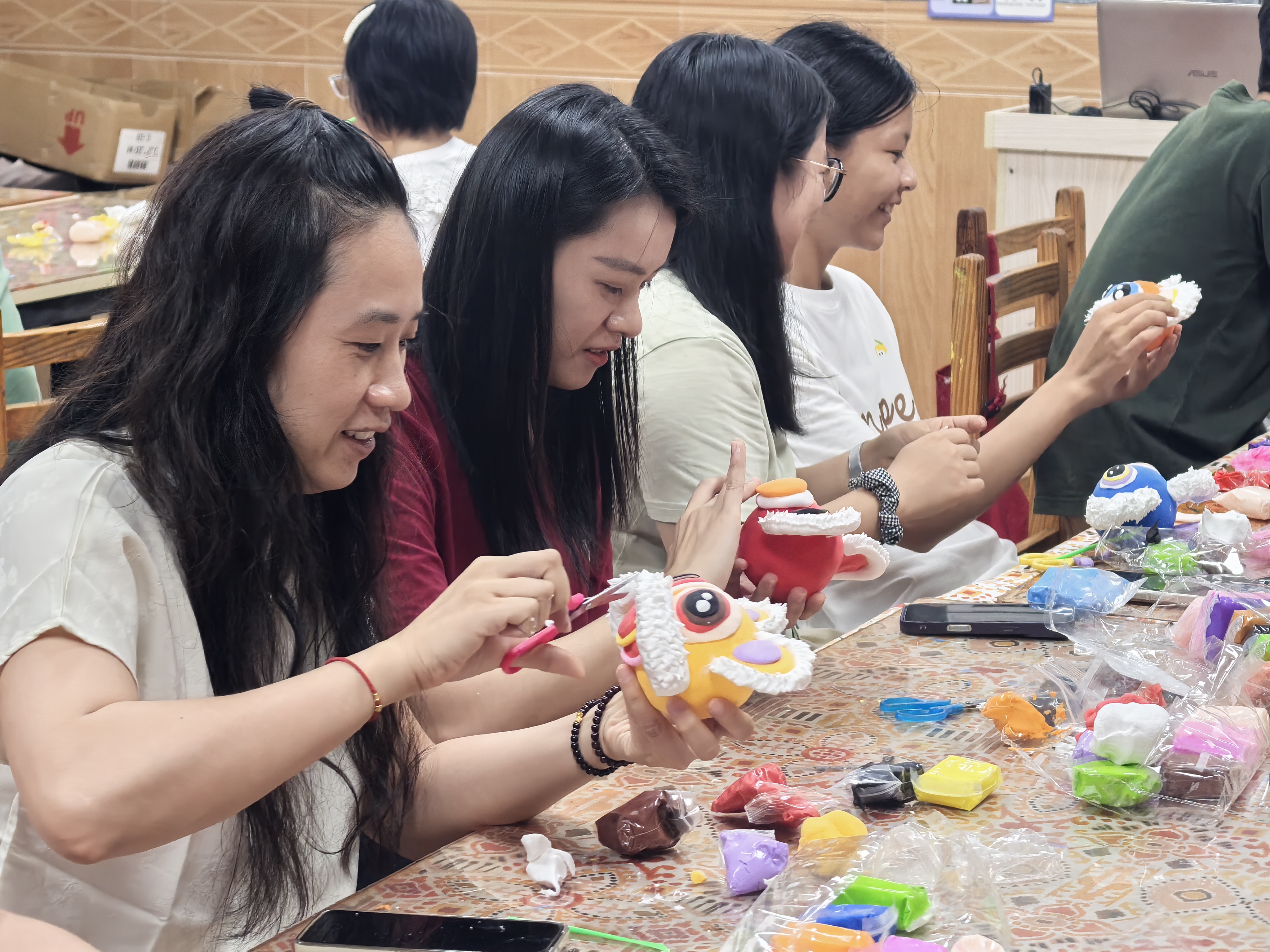 经过两个小时的沉浸式创作,原本平平无奇的黏土在学员们的指尖下逐渐完成蜕变:有的狮头咧嘴含笑,红鬃飘逸似关公狮;有的怒目圆睁,黄角峥嵘如刘备狮;还有学员大胆混搭色彩,赋予醒狮现代审美表达。学员颜小姐分享说:“刚才捏狮眼时我特别专注,感觉自己不是在玩黏土,而是在和千年的传统对话,这种感觉特别奇妙。”