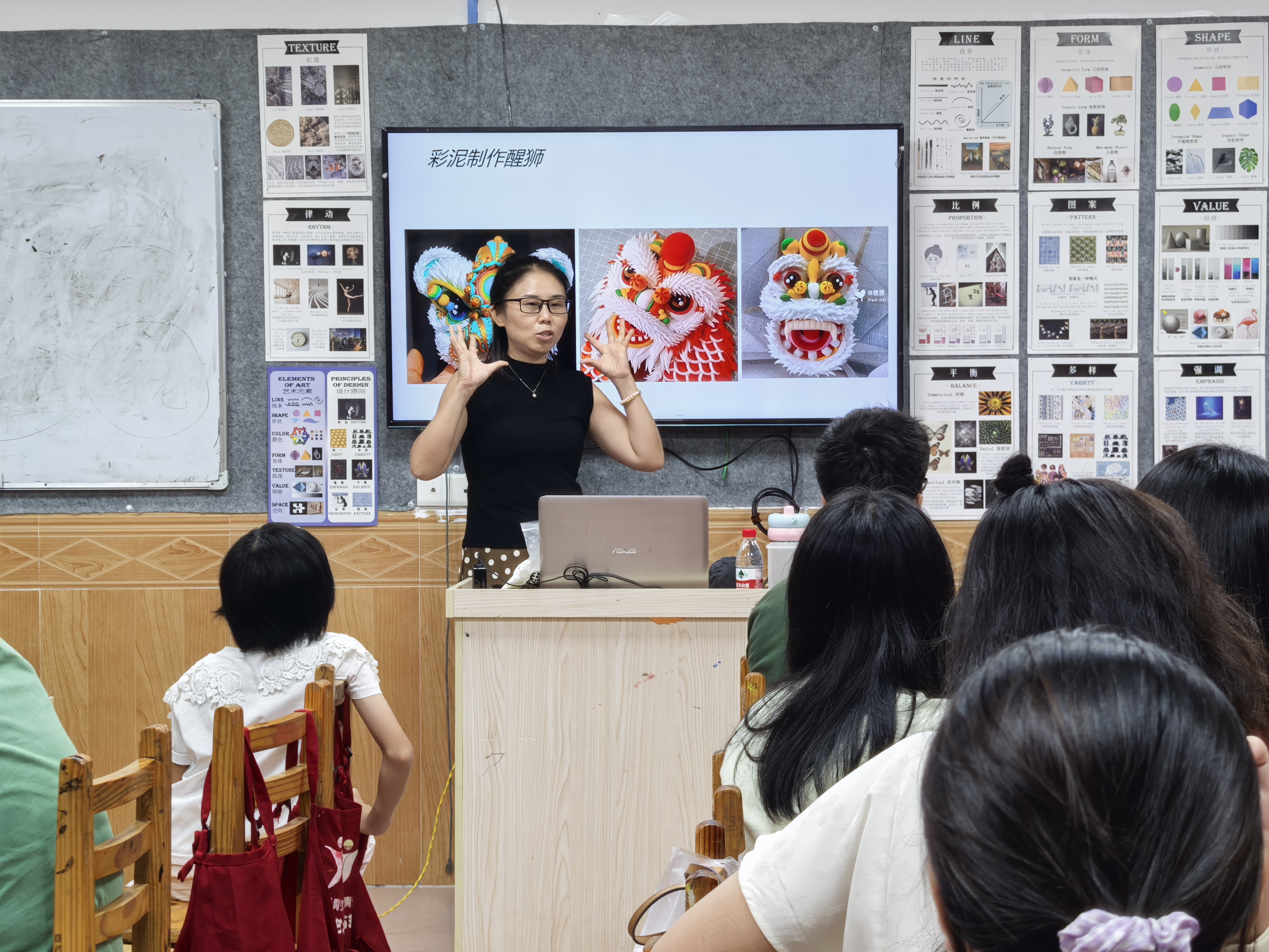 “醒狮不仅是节日里的热闹表演,更是承载着千年文化记忆的活态传承。”老师开场便点明了醒狮的深厚文化价值。随后,她详细追溯了醒狮的起源与发展:醒狮文化最早可追溯至唐代宫廷狮子舞,五代十国时期,随着中原移民的脚步,这一独特的艺术形式传入岭南地区。到了明代,醒狮在广东佛山逐渐形成雏形,并在此后不断发展演变,成为岭南地区极具代表性的文化符号。当讲到狮头造型的寓意时,她指着投影上的图片解释:“额高嘴阔象征纳福,圆眼含威代表明辨是非,这些细节都是老祖宗留下的智慧。”通俗易懂的讲解让学员们听得入神。