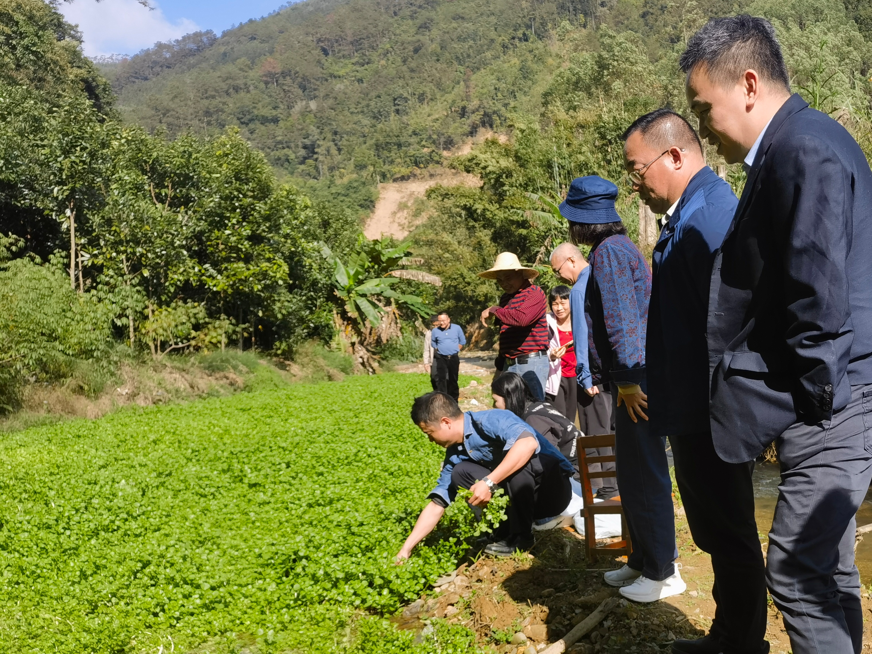 在冲枚村委西洋菜种植基地,新农人“沙梨哥”向调研组热情介绍当地优越的生态环境和西洋菜特色——引用山泉水灌溉,口感清甜爽脆,营养丰富。调研组鼓励驻镇工作队要帮助农户立足资源优势,狠抓产品质量,加强宣传推广,推动特色蔬菜产业品牌化发展,做到“既讲味道,更重名气”。