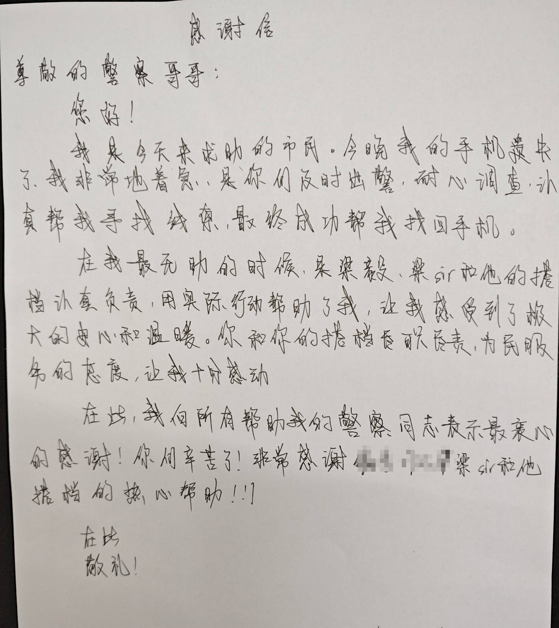 “你们认真负责、高效为民,让我非常感动!”在都城派出所,潘女士亲手将一封手写感谢信交到民警手中。原来,她在商场不慎遗失手机,心急如焚。值班民警迅速响应,耐心安抚情绪,围绕其活动轨迹细致排查,仅用一小时便成功寻回手机。潘女士在信中写道:“你们的付出,让我感受到温暖与安心。”