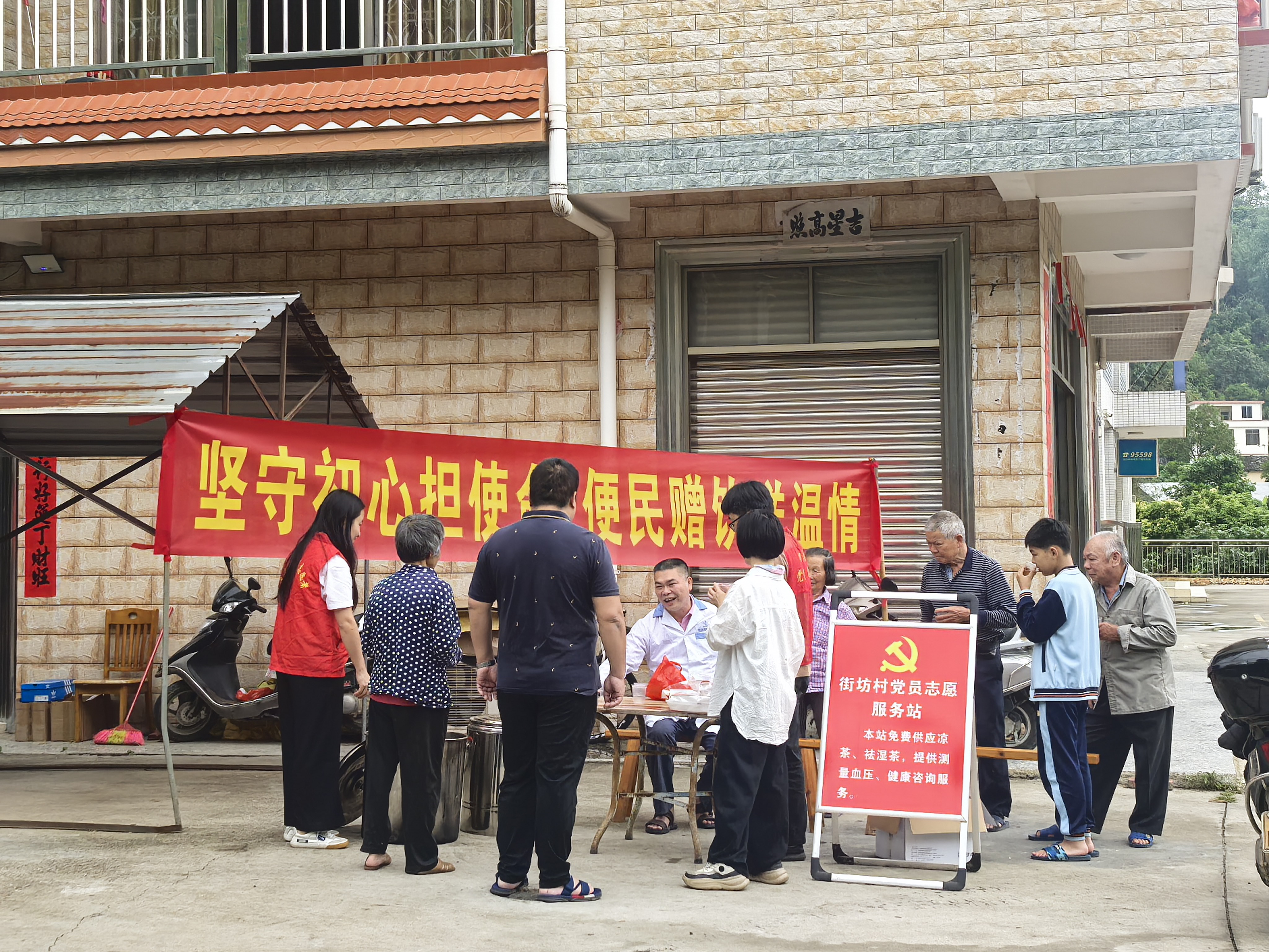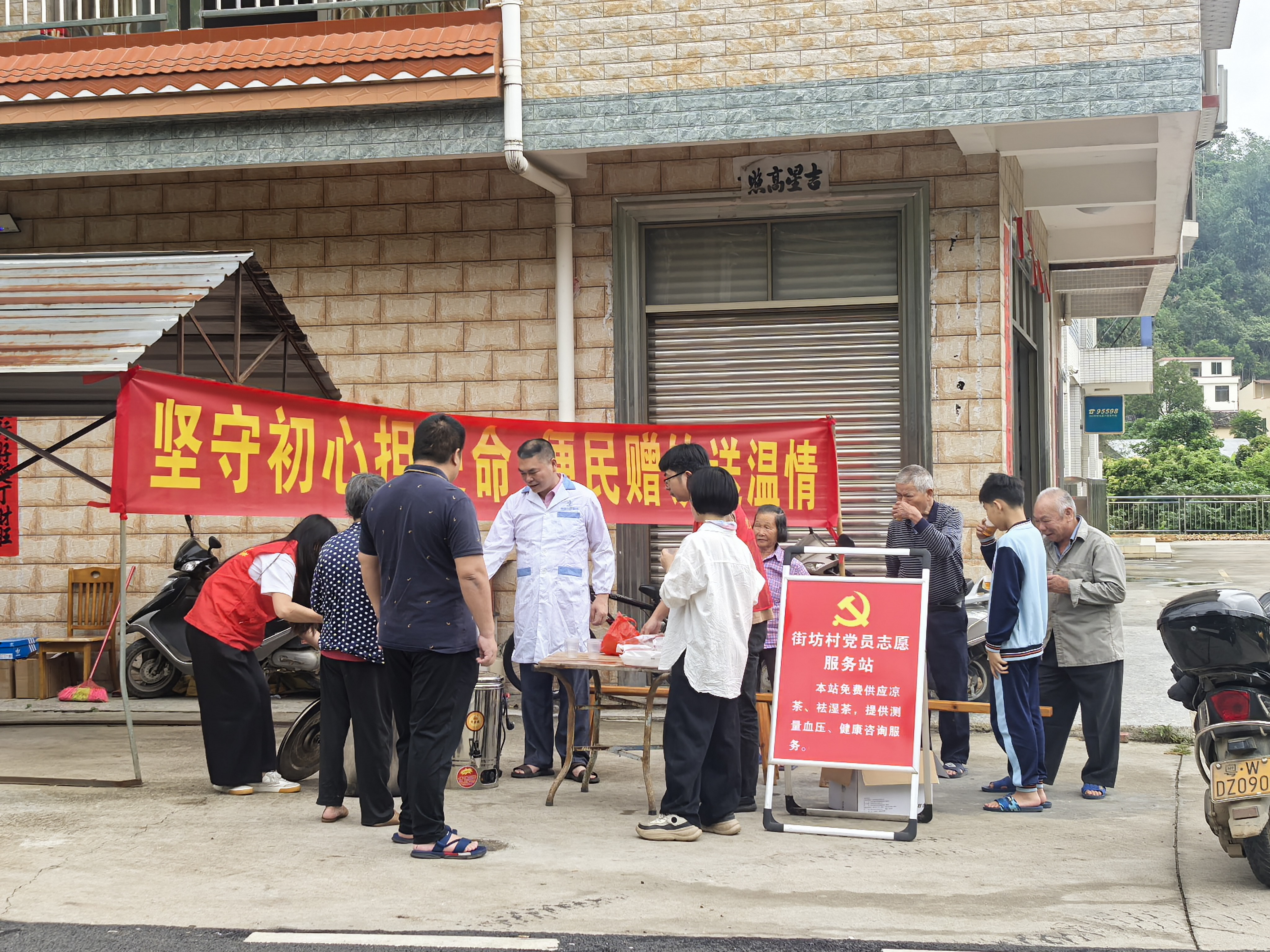 活动当天,街坊村党群服务中心在镇上某药店门前设立党员志愿者服务站。党员志愿者们早早将精心熬制的凉茶摆放整齐。该凉茶由曾在通门镇卫生院工作多年的党员志愿者冯东明免费提供,选用菊花、土茯苓等中药材熬制,具有清热解毒、祛湿护肝等功效。志愿者们热情地为过往村民送上凉茶,并耐心讲解茶饮功效。“这凉茶喝起来甘甜爽口,喝完感觉整个人都舒服多了!”村民李阿姨连连称赞。