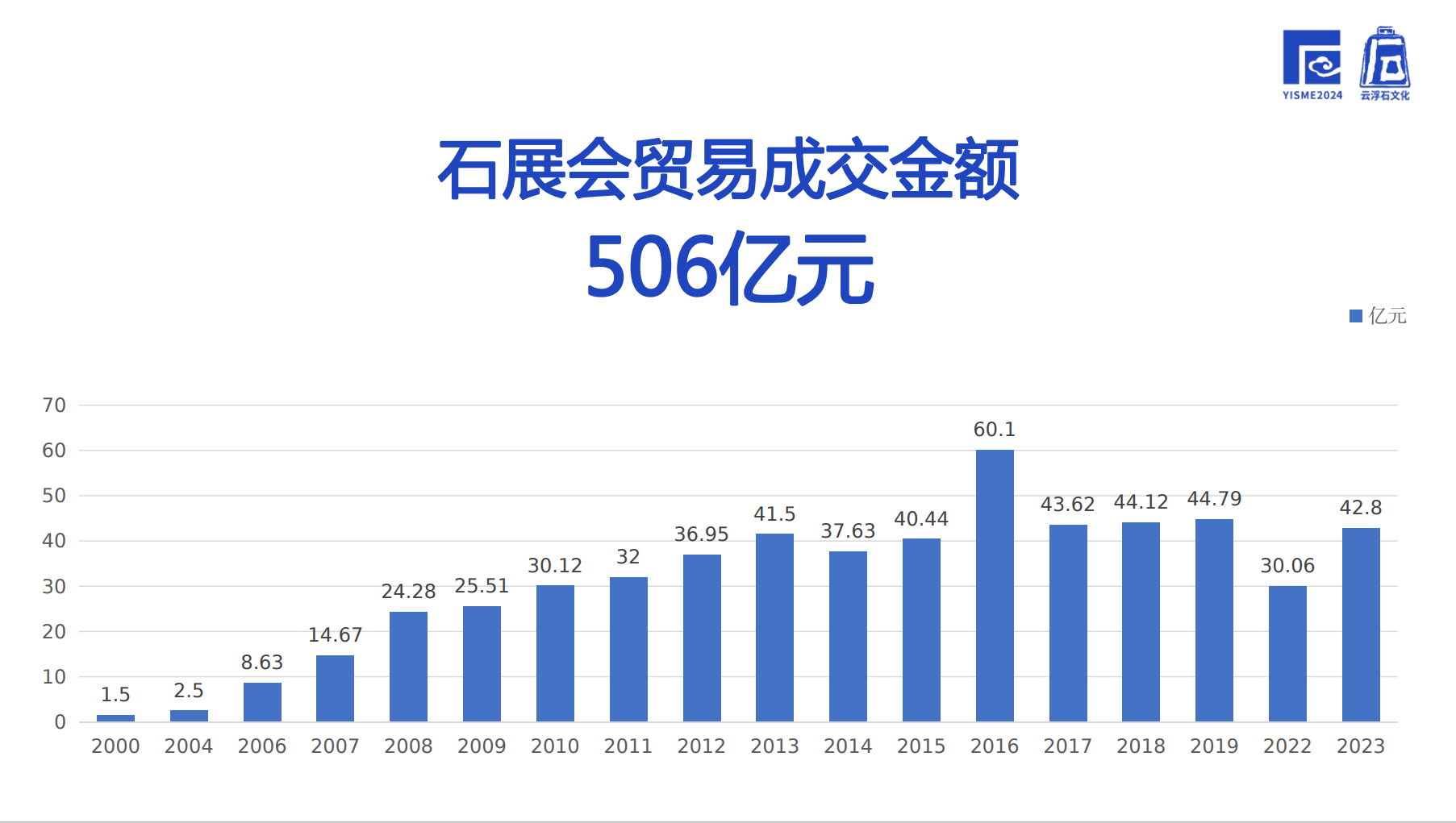 ●盛况:本届石展会石文化节展销两旺,4天进场人数10万多人次,总交易额达44.121亿元,总交易额比上届增长5.3%,实现经济效益和社会效益双丰收。