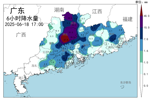 18日白天,清远南部、韶关南部、惠州北部出现中到大雨,局部暴雨,其余市县出现分散阵雨,局部中到大雨。