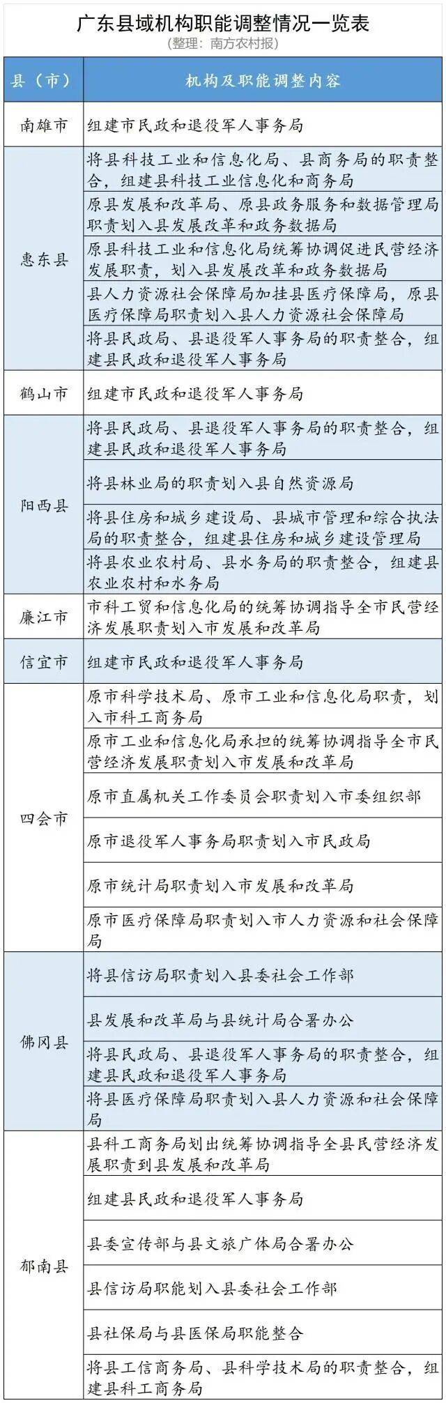 其中,南雄市、惠东县、鹤山市、阳西县、信宜市、佛冈县和郁南县等7地均组建了“民政和退役军人事务局”,原四会市退役军人事务局职责划入四会市民政局;四会市、郁南县、惠东县和廉江市等地工信和商务等系统承担的统筹协调指导全市民营经济发展职责,均划入各地发展和改革局;惠东县、四会市、佛冈县和郁南县将医疗保障局职责划入人力资源和社会保障局。