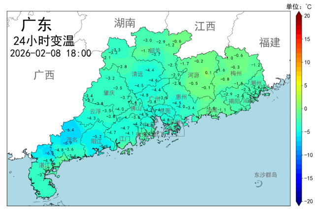 在8日白天,受冷空气影响,广东大部分市县白天的最高气温较7日明显下降,其中粤东市县下降了1℃-3℃,其余大部下降3℃-8℃。