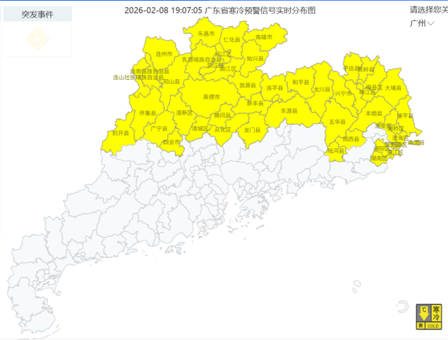 截至8日19时7分,广东中北部大范围市县的寒冷黄色预警继续生效。“降温+大风”,体感温度更低,朋友们注意保暖。