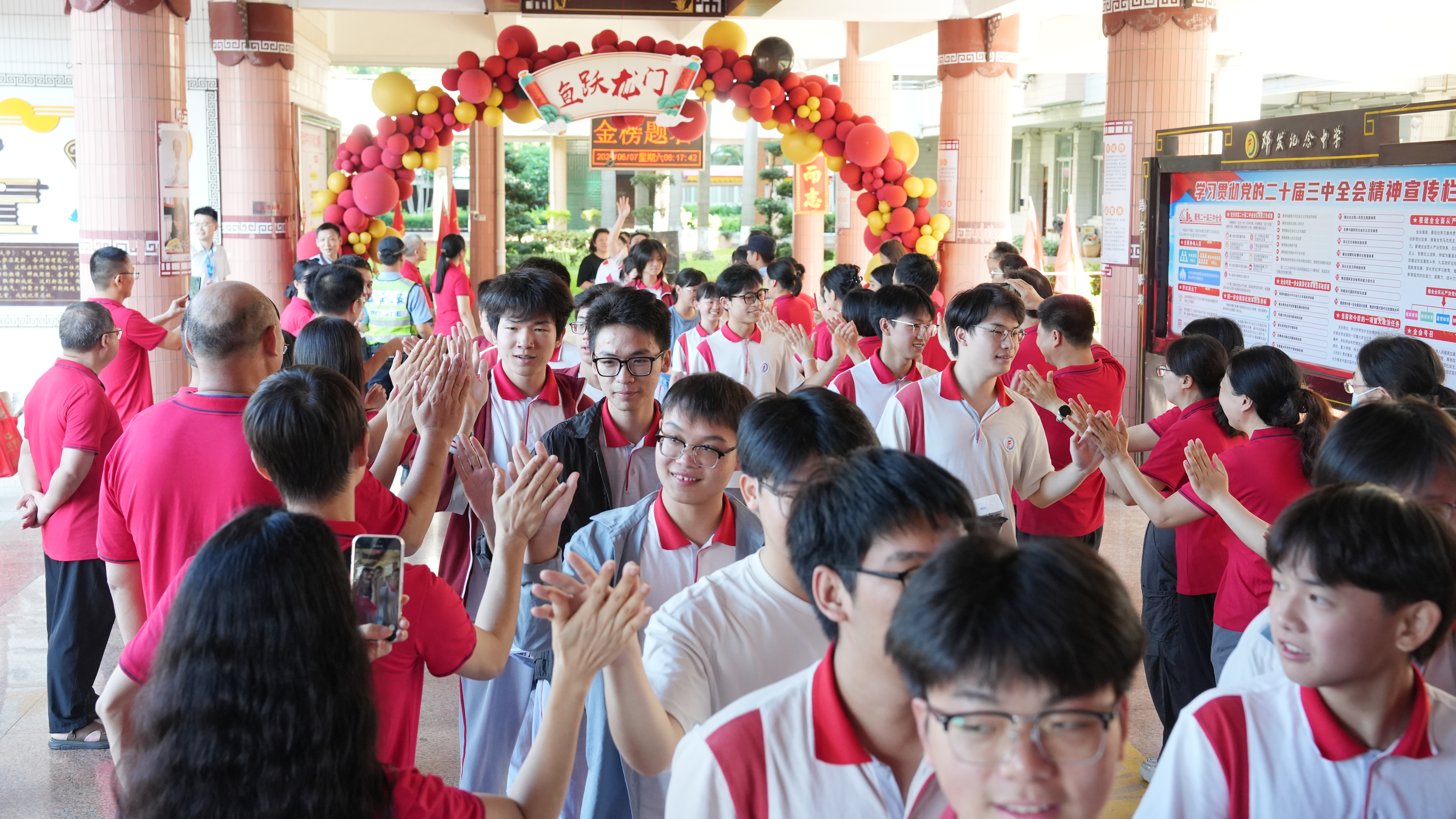 6月8日,在云浮考点,老师们为考生加油打气。