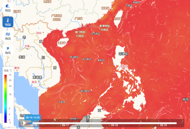 秋台风一般是指8月下旬或9月以后,有明显冷空气活动之后的台风,此时热带西北太平洋和我国南海的海温往往比7—8月更高,暖水更深厚,利于台风发展。比如从中国海洋预报网的图看,西北太平洋海温基本超过30℃,给台风发展持续提供能量。