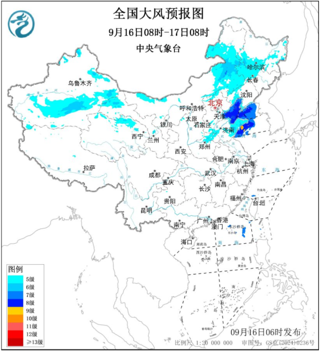 中央气象台16日6时发布蓝色大风预警,预计16日8时—17日8时,新疆东部及南疆盆地、甘肃河西、青海北部、内蒙古西部和中东部、东北地区西部、山东半岛等地部分地区有5级、阵风7级的大风。