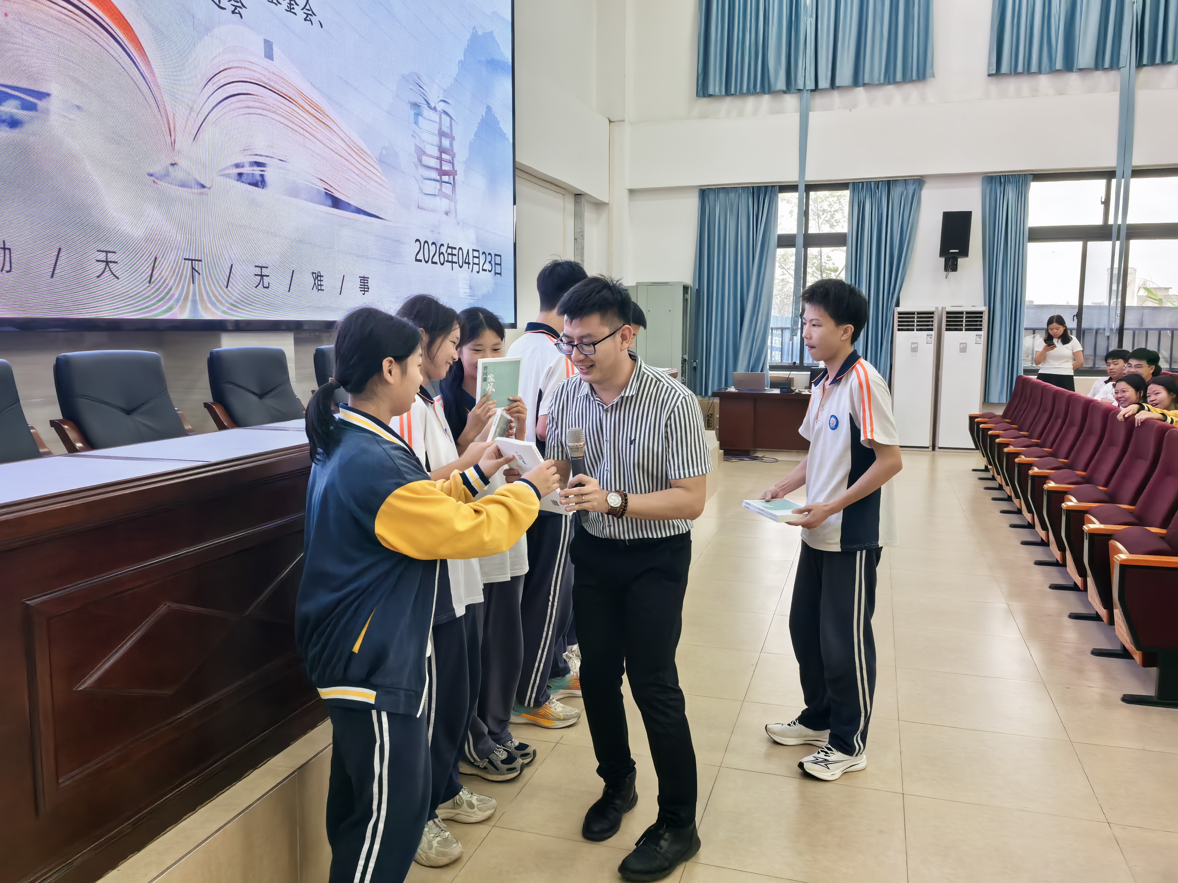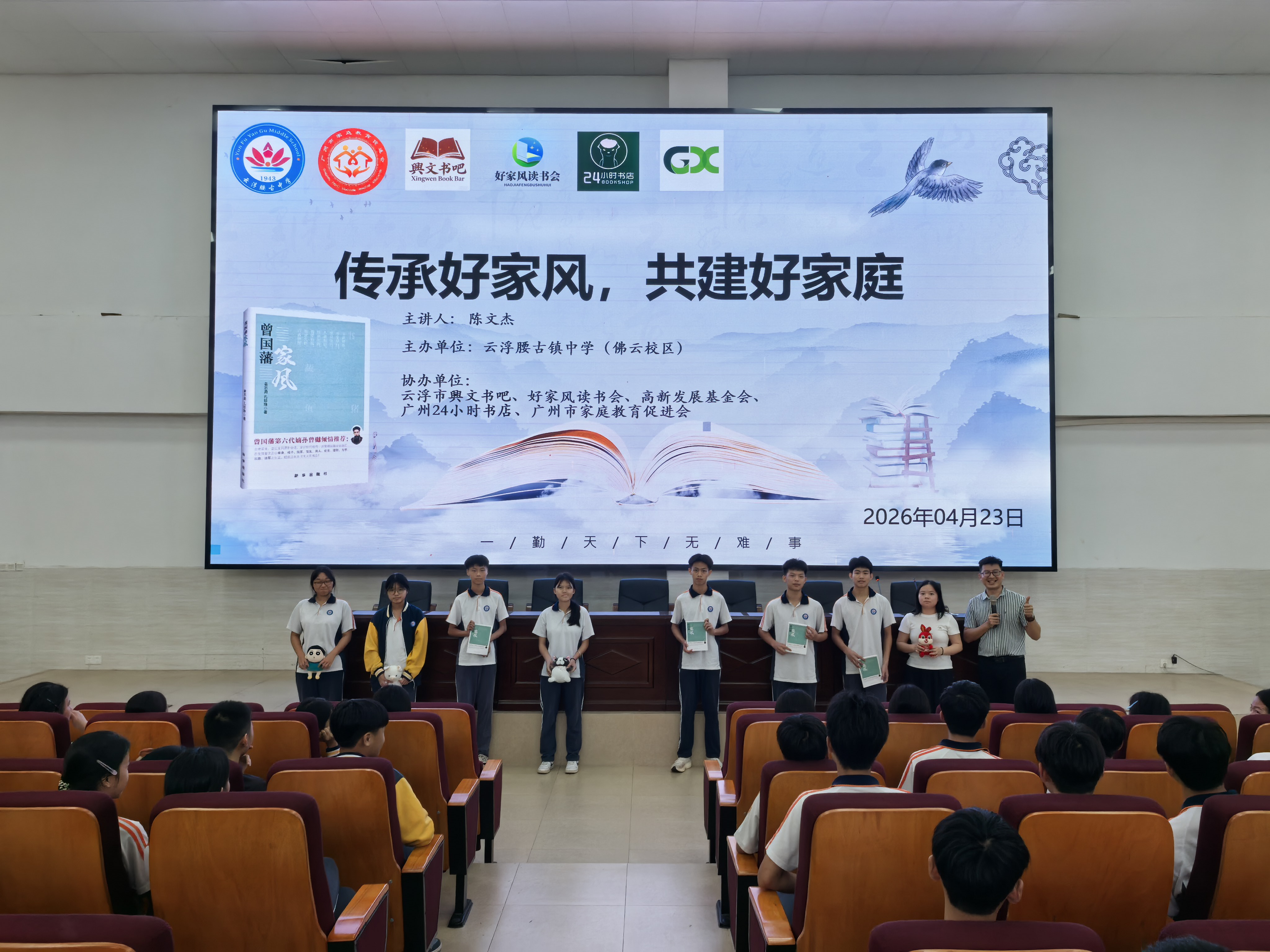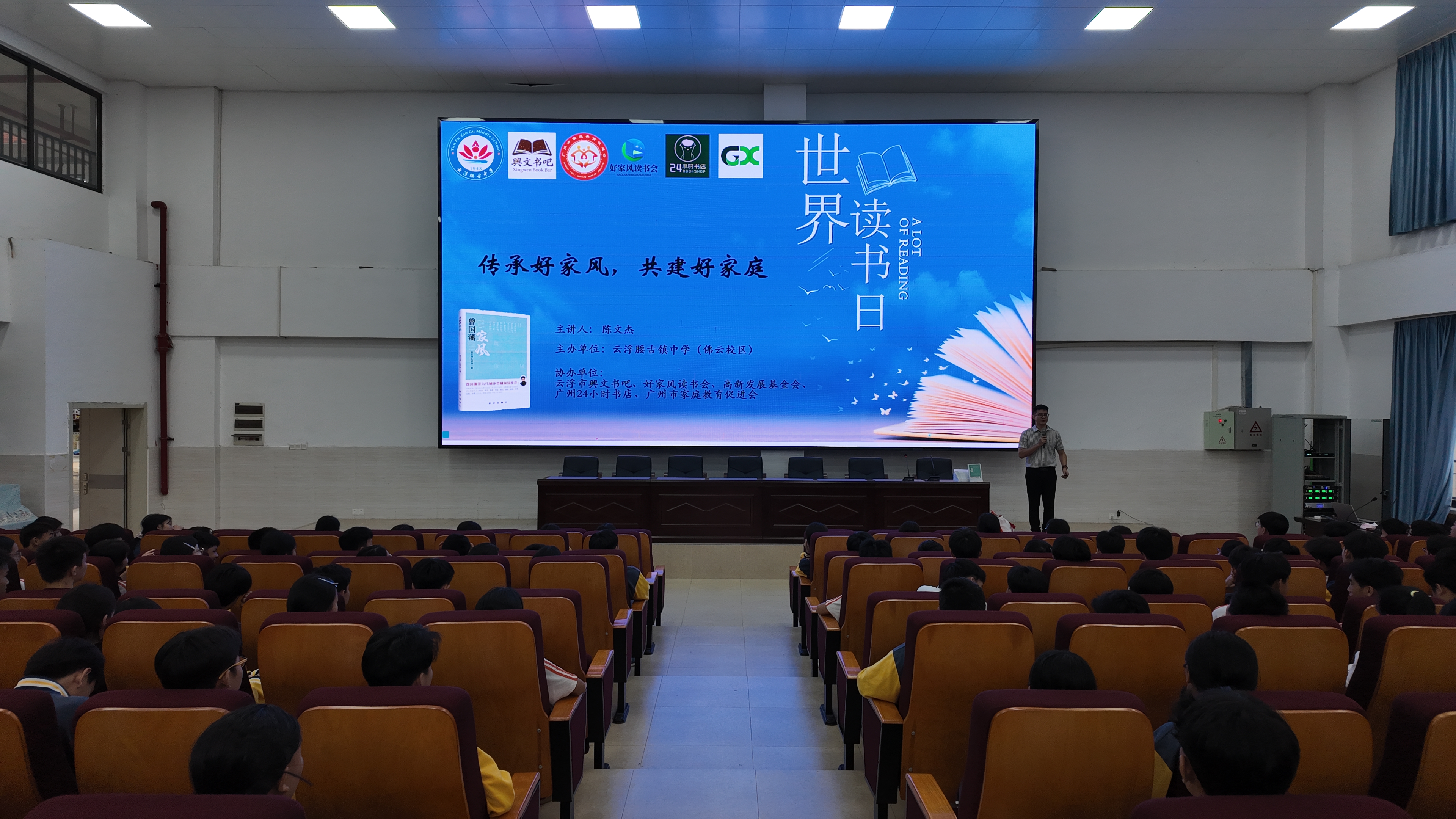 4月23日世界读书日,云城区腰古镇中学佛云校区举办“传承好家风,共建好家庭”主题宣讲会。活动特邀广东省高新技术高级技工学校陈文杰老师主讲,为全校师生带来家风建设与青春成长的智慧分享。