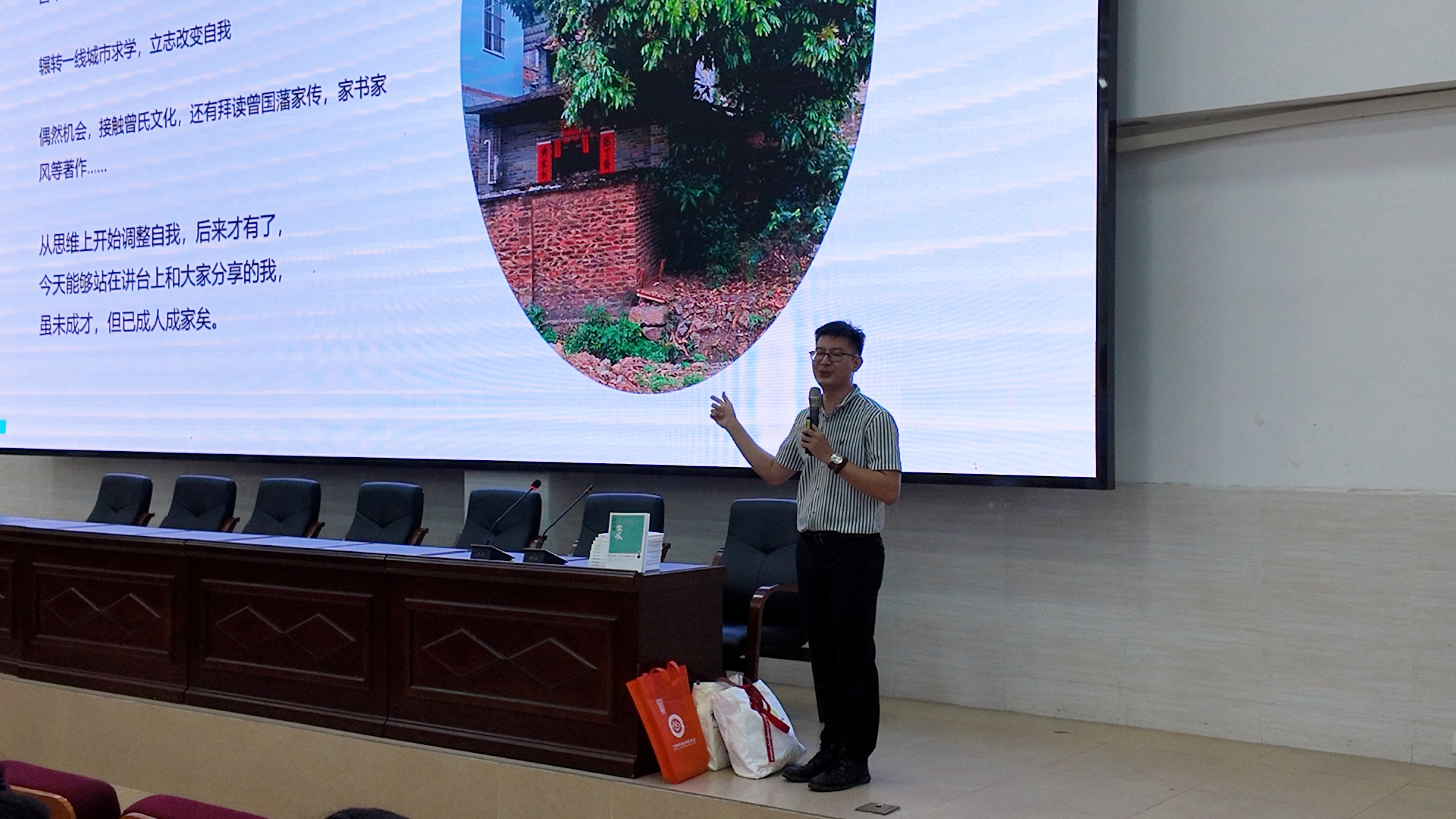 宣讲会上,陈老师结合晚清名臣曾国藩的家风智慧与自身经历,提炼出“书、勤、和、俭、敬、恕、省、健”八字心决,倡导多读书、勤奋斗、家和睦、俭修身、敬尊长、恕待人、常自省、强体魄。幽默生动的讲解赢得阵阵掌声。