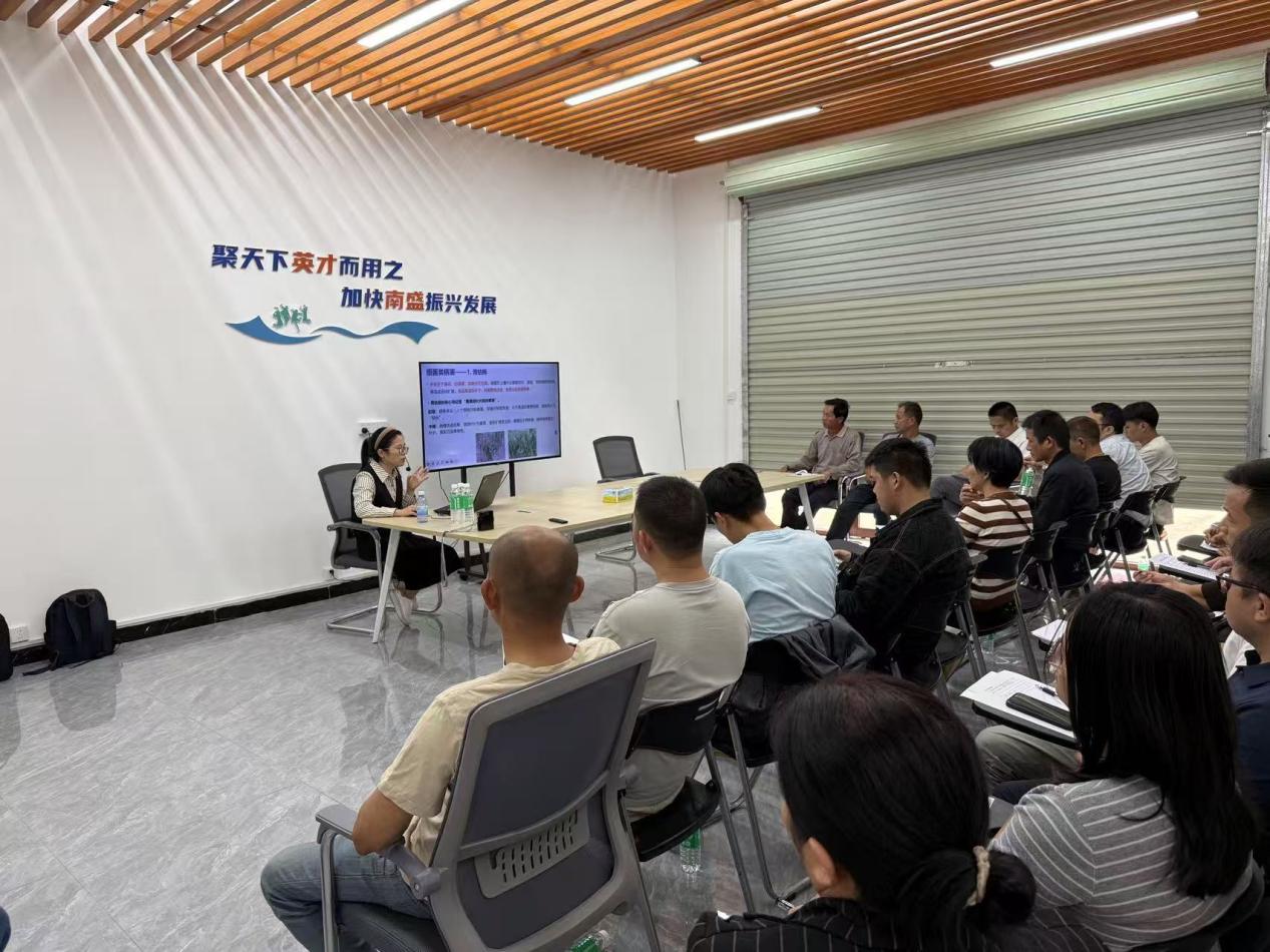 培训课堂上,两位专家精准对接青年创业者的实际需求,结合南盛镇的土壤和气候特点,用“拉家常”的方式讲解辣椒、叶菜的栽培管理和病虫害问题。“对辣椒植株整枝立架能够有效避免坐果太重损伤枝条而导致减产;定植辣椒时,株距要保持40厘米,太密了通风不好,容易生病;叶菜要注意均衡施肥,偏施速效氮肥,现蕾时追施重肥。”专家不仅细致教大家辨别蚜虫、霜霉病的早期症状,还分享了实用“打药万能公式”,推荐汇丰二号辣椒、粤农节瓜、粤翠1号菜心等适配本地种植的优良品种。台下,青年学员们一边快速记录核心知识点,一边不时与同伴交流心得,学习热情高涨。