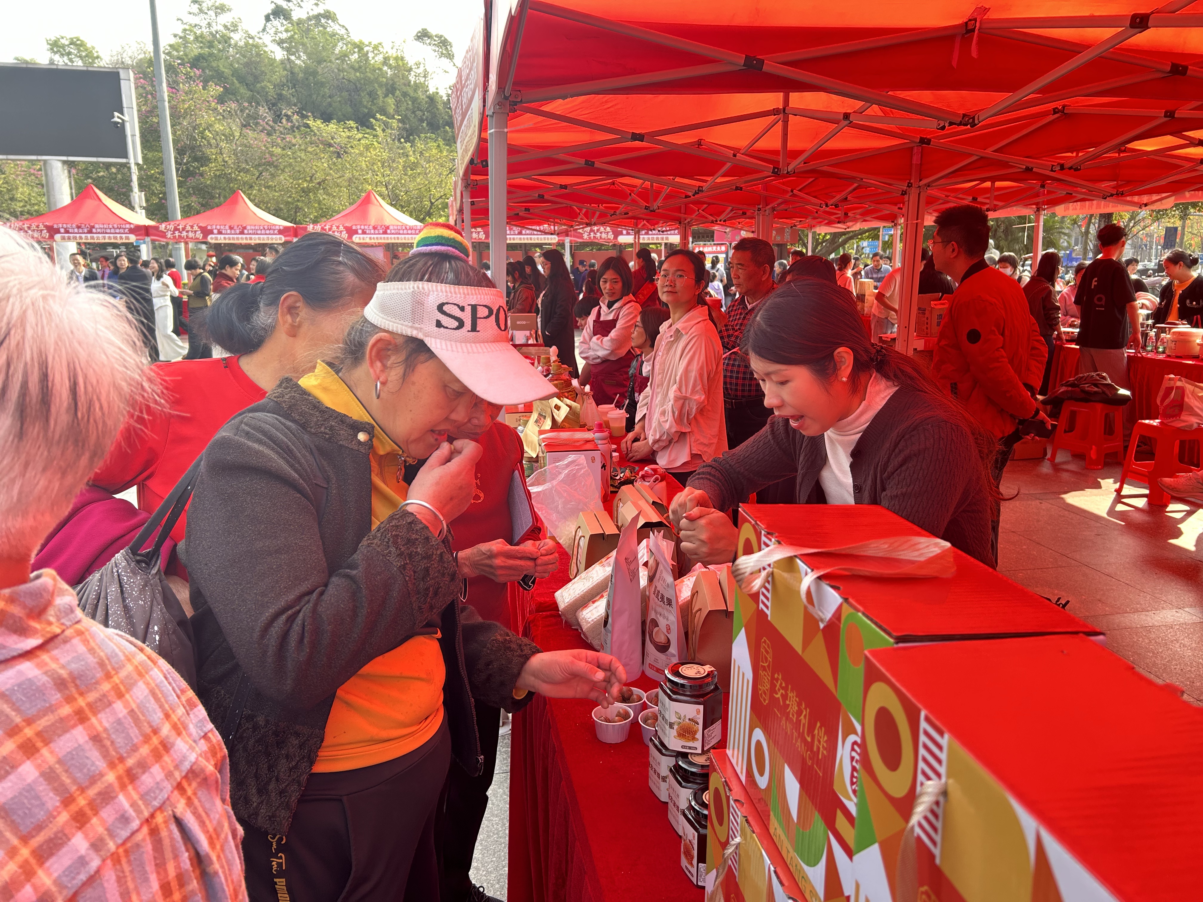 展销现场人头攒动,特色农产品、非遗手作、文创产品琳琅满目,吸引市民驻足品鉴选购。“安塘伴礼”的“安塘四宝”融合乡土风情与伴手礼文化,广东小阳生态农业的绿色牛大力凭健康品质圈粉,云浮市新云实业的百年非遗炒米饼香飘全场,菩提树下・非物质文化遗产体验的漆扇、扎染等手工艺品则开放现场制作体验,让传统文化焕发新生。