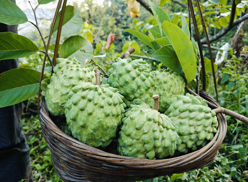 释迦果,又名番荔枝,因其表面鳞目凸起形似佛教中释迦牟尼的头型,自带一种天然的禅意,故而得名“释迦”,也有着“佛头果”的雅称。它是一种典型的热带水果,喜温暖湿润、阳光充足的气候,而红营村的果园大多位于山地缓坡之上,昼夜温差大,为果实积累糖分提供了充足的气候条件,其果实外形圆满,果皮呈现自然的淡绿色或黄绿色,通常在果皮略微变软、鳞目间泛黄时风味达到巅峰。