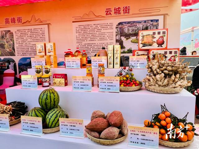云城街的圣女果,高峰街的百香果,河口街的灵芝鸡,安塘街的红营茶和无花果,南盛镇的香水柠檬,腰古镇的剑花,还有香米、番石榴、沃柑、水果玉米……产品琳琅满目,让人看花了眼。