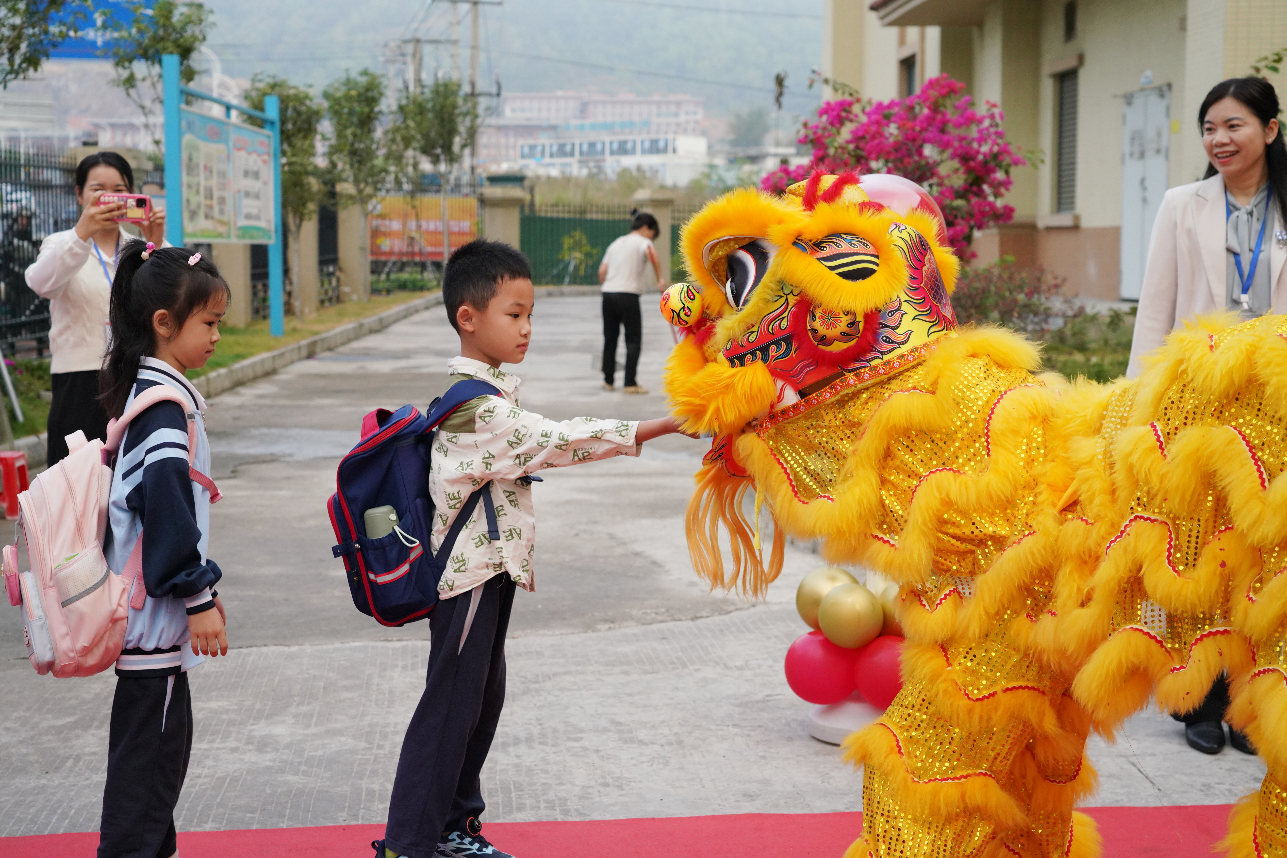 伴随着欢快的鼓点,一只憨态可掬的小舞狮摇头摆尾地穿梭在人群中,时而与同学互动,时而跳跃起舞,为开学第一天增添了浓浓的喜庆氛围。