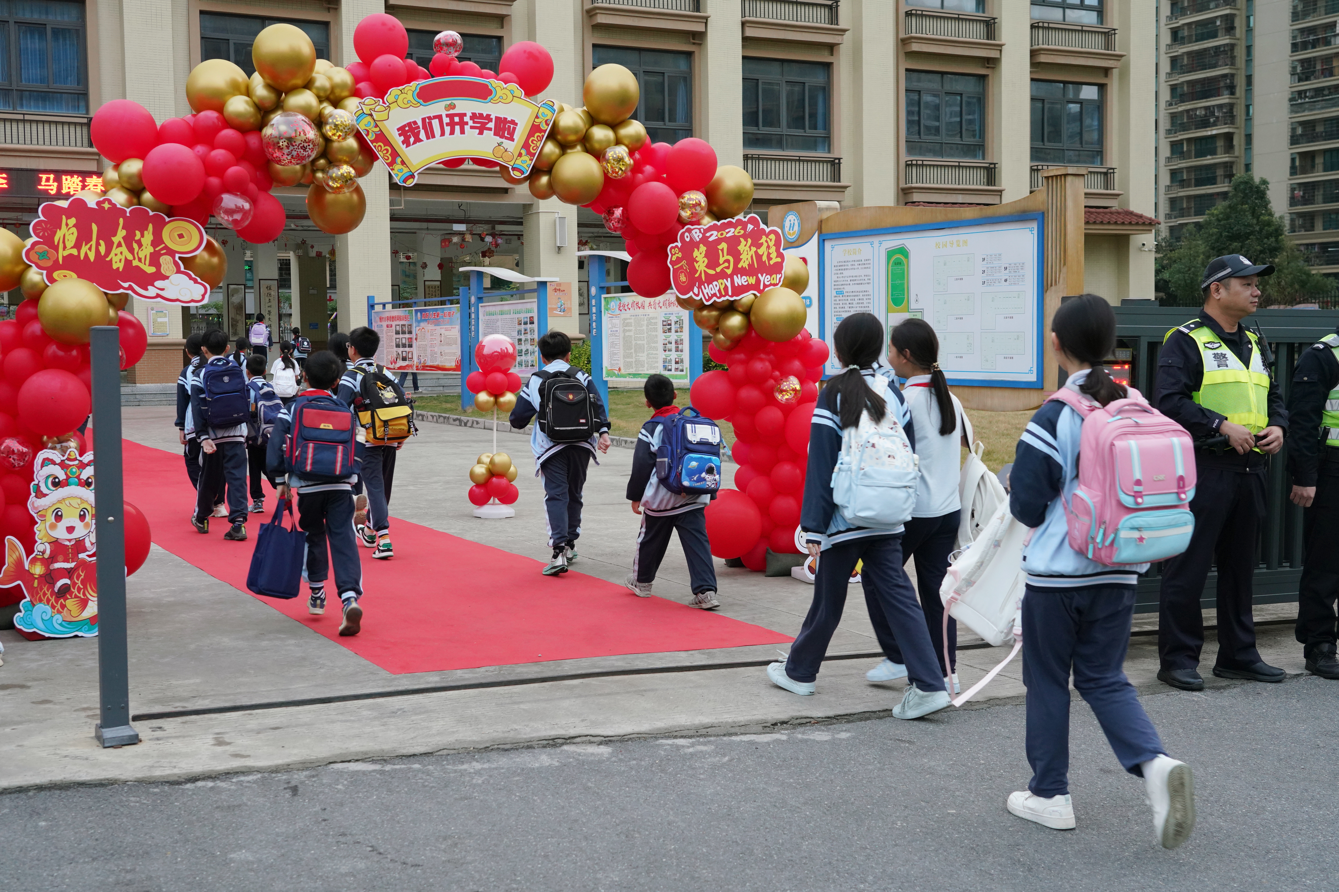 早上七点,恒大小学的校门口已经热闹起来。学生们背着书包,踏着轻快的步伐走进校园。不少学生纷纷在此驻足,手持卷轴拍照打卡,记录下新学期第一天的美好瞬间。