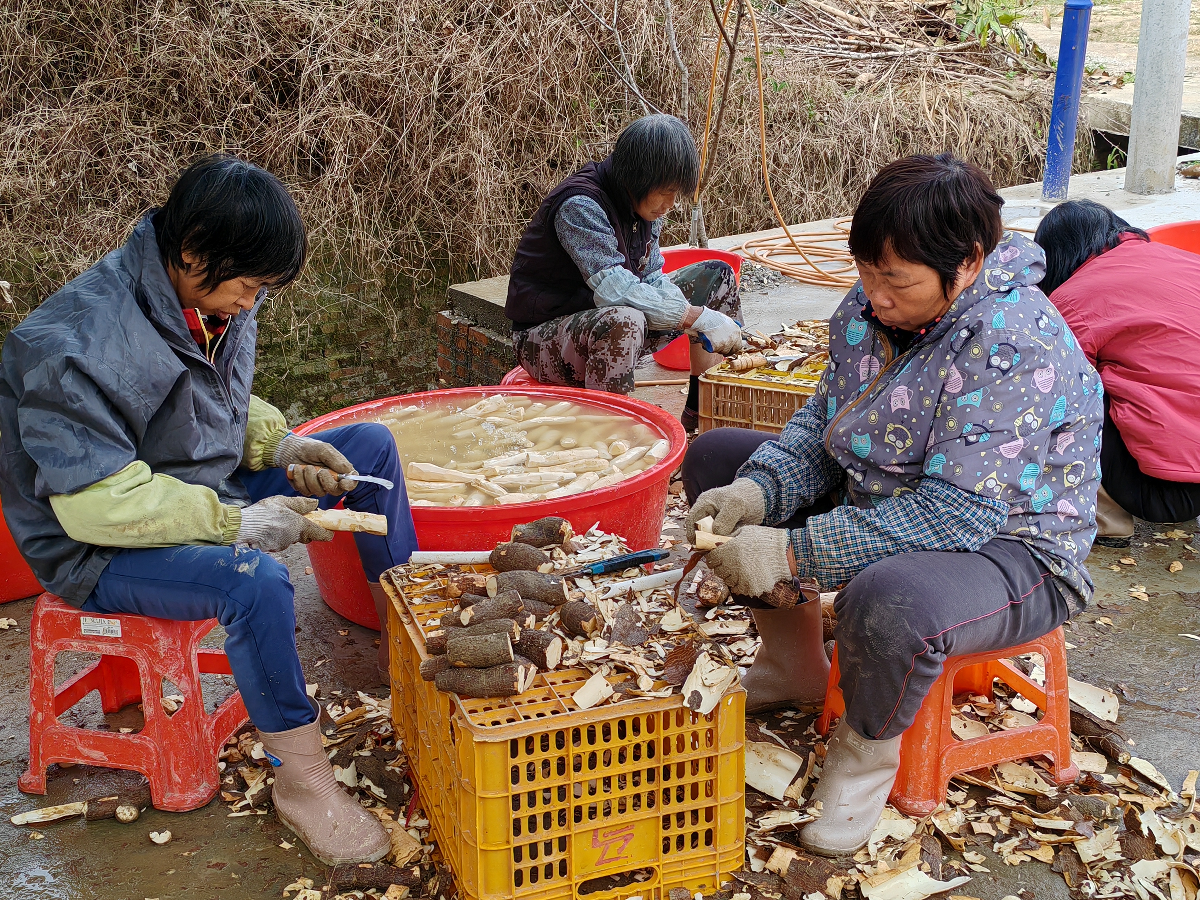 黄心木薯的核心价值在于其金黄饱满的薯肉,凭借优良品质,不仅赢得了本地消费者的喜爱,更打开了广阔的市场空间。在村内木薯加工点,10余名村民正有条不紊地开展剥皮、打包、分装工作,新鲜采收的木薯经过简单处理后,便会发往各地市场。“以前在家没事做,现在村里有老板大规模种植黄心木薯,我每天来这里干活,一天能挣120多块,既照顾了家庭又有收入,特别满意。”村民陈大姐手法娴熟,笑意盈盈地说着。这份“家门口的岗位”,让留守妇女、中老年村民实现稳定增收,采收期日均用工超60人,“田间工厂”让村民务工增收不用远行。