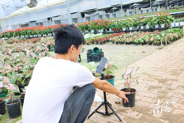 “各位朋友们好,这就是我们最新培育的彩叶芋。”大棚内,钟克飞通过视频平台直播进行花卉销售,作为组培室配剂师,从今年1月开始,他都会定期在下午两时半进行直播,为观众们介绍各式花卉。