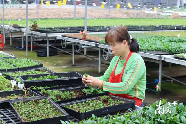 在育苗大棚,工人们正根据花卉生长情况进行种苗挑选,达到出产条件的种苗便会打包进行销售。“我们现在约40%的种苗会出口到东南亚市场,40%会销售到广东本地及国内其他地方,20%会将其培育成盆栽运送到广州的花卉市场及进行线上销售。”谢卓志介绍道。