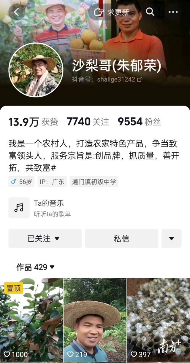 “大家好,我是‘沙梨哥’!”这是他一贯的开场白。视频里的他常常笑容灿烂,走在乡野田间,记录着果树成长的点滴,分享着一名农民亲身经历种植、管理、收获的过程。