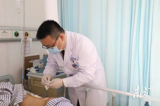 “叔,现在到换药时间了。”进入病房,阮书豪熟络地与患者打招呼,清创、换药、包扎……动作熟练而麻利。“今天感觉怎么样?有没有哪里不舒服?”他的话不多,但语气温和。了解到患者一切如常后,他利落地收拾好药物,轻轻地为患者调整好休息姿势,然后开始了下一项工作。