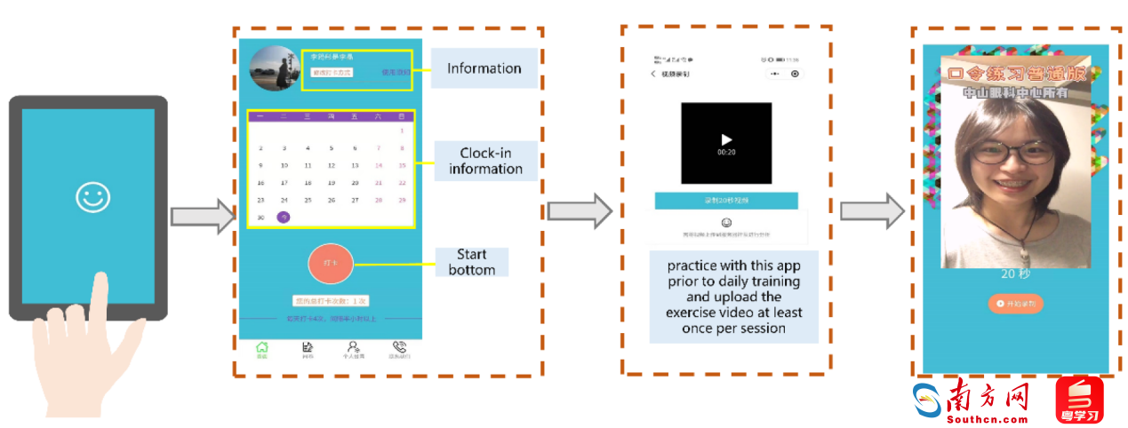 在此项研究中,研究团队通过一项前瞻性、非劣效随机对照临床研究,纳入299不伴中重度角膜荧光素染色的有症状干眼患者,并随机分为2组,分别接受8周人工泪液0.1%玻璃酸钠治疗,或“笑的训练”,并采用小程序全程记录干预情况。