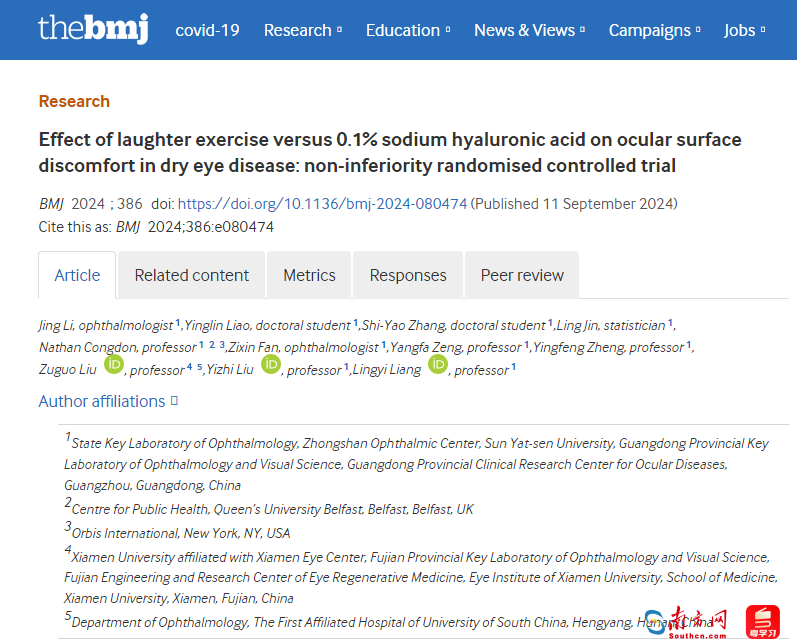 9月12日上午,中山大学中山眼科中心在珠江新城院区实验楼召开媒体发布会,介绍其最新的研究成果——中山大学中山眼科中心梁凌毅/刘奕志教授团队和厦门大学眼科研究所刘祖国教授团队在国际顶级医学期刊The BMJ发表研究论文,证实了“笑的训练”对干眼的治疗效果,从崭新角度提出了一种有效、安全、低成本且环境友好的非药物治疗手段。